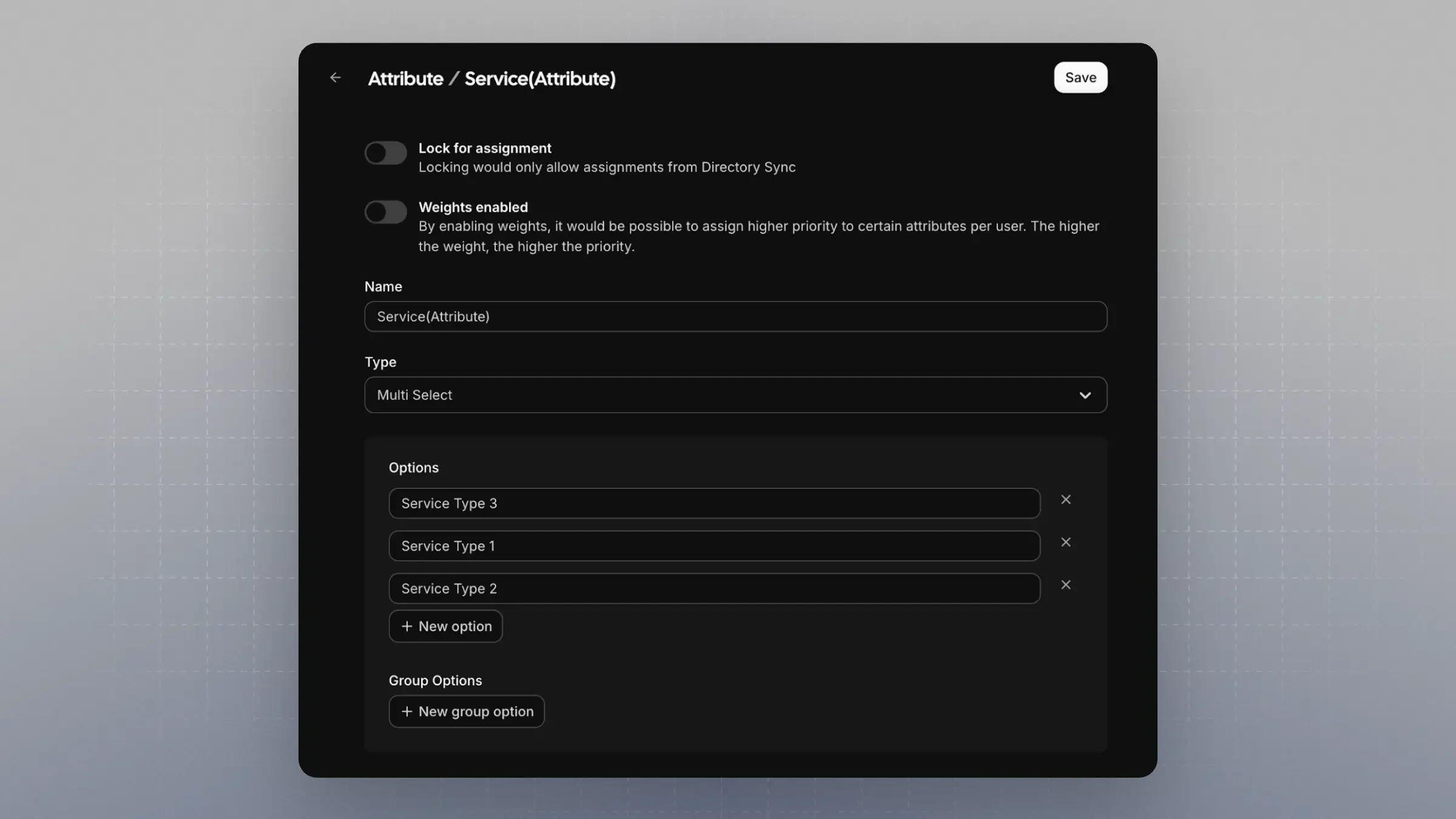 • Example: A Service field with identifier service, where the options are identical to those in Service (Attribute).